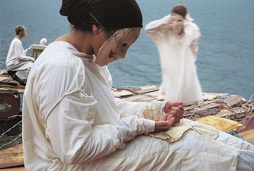 multi-screen installation by Kooj Chuhan (director) + Aidan Jolly, Tang Lin, Jilah Bakshayesh, Miselo Kunda, Hafiza Mohammed - the v02 collective. Three masked figures each on a raft at sea appear on each of three screens arranged as a circular triptych, and their respective identities as official, migrant parent and child unfold. The absence of land makes land more critical to the physical drama in which the surveillance-conscious official finds ways to deny the parent access to safe land and community while also engages in lucrative military games. The parent is occupied looking for her child and trying to salvage her homeland, while her child plays with fragments of photographs of people’s faces which never fit together. The final terror-ridden conclusion is posed as an inevitable consequence, a real-life tableau true to current day conflicts to reflect on. In the absence of any dialogue the installation uses poetic and minimalist devices to depict asylum in the new world order, and each repeat loop of the work has a different soundtrack suggesting alternative meanings for the same reality. A suspended net connects the three screens and the viewers must lower themselves below it to come closer to the lone dialogues from a single screen stranded amongst rocks on the floor below the net. From this emerges intermittent poetry from a ghost-like face, quietly reflecting on the thoughts of one under compulsion to seek a new life. The double-edged uses of blood (symbolising both life and death) and water (allowing respite from land conflict yet uncomfortable due to its temporary nature) are also central to the visual language of the work. The artists chose not to deflect from the stark realities that human individuals are responsible for both causes and consequences of a grim world order in which global conflict is created or fertilised by western interests which then demonise the asylum-seeking products of that conflict. Through collaboratively developing Tang Lin’s minimalist poetry on the beauty and suffering of such human concerns, this incredibly compact and cohesive work manages to emotively engage with a truly epic political narrative. |