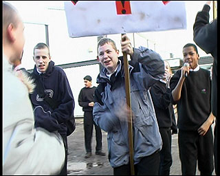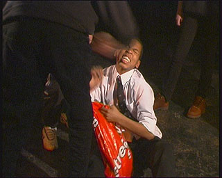 single-screen video work by Kooj Chuhan with the Lo-Stock Hi-Drama group A turbulent video installation produced by Kooj Chuhan and drama students at Lostock High School, based on the book "Refugee Boy" by Benjamin Zephaniah, in which a series of doubts and myths are overcome in the joint efforts to stop fellow student and refugee Alem Kelo from being deported. This is the result of a series of workshops at Lostock Community High School in Trafford, Gtr Manchester, which began with a set of sessions called "Borders Between People" to discuss the issues around asylum, devised by Kooj Chuhan and teacher Mark Krantz. Critically, they found that discussions based around simple human concerns, which avoided the usage of phrases such as ‘asylum-seeker’ yet focused on exactly the same issues, led to a completely different dialogue and perception of the issue – one which was almost universally sympathetic and led to the students all writing passionate letters to the Home Secretary. Mark is keen to use these materials on an annual basis to form a regular module within the 'Citizenship' curriculum. As a part of these workshops, particular extracts from the excellent novel "Refugee Boy" were used. Following this came a short series of drama and video workshops by Kooj with teacher Sue Hilton which involved various scenarios to recreate abstracted ideas from "Refugee Boy", and designed for shooting on video. The students responded to the idea that Alem Kelo (the main character in "Refugee Boy") was actually at the school and about to be deported. The ‘turning around’ of many students views which took place during the “Borders Between People” sessions became the basis for the video narrative in which a variety of race disputes are resolved by simple human appreciation for a fellow student’s predicament. In addition to scripting and production, the students also carried out an entire set of rough edits for the work. Mark Krantz continued to use methods and video material from this project in subsequent years and wrote an article reflecting on the experience entitled "Alem's Story: A school explores contradictions within attitudes to asylum using video art". |