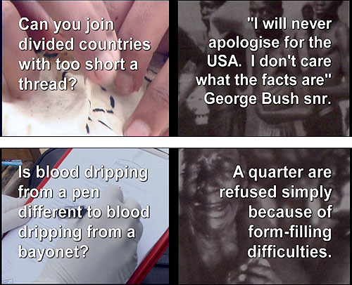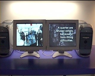 two-screen portable installation by the virtual migrants i2 crew A distillation of the key elements within Terminal Frontiers, probing popular misconceptions and also suggesting alternative questions. Comprising two electronic screens without sound, the left screen comprises a series of texts which ask open-ended questions relating to particular concepts explored by Terminal Frontiers, superimposed over relevant sequences either from specific works or created by local groups through workshops. The right screen comprises a series of texts which simply give a selected assortment of information relating to asylum and globalisation, superimposed over subtly animated black-and-white news stills. The two looping sequences are of different lengths so that the left-right juxtapositions of questions and information continually change. The information on the right is not designed to answer the questions on the left, though there will always be any number of direct or indirect relationships between the two. Through watching the piece at different moments over time, the viewer is able to discover for themselves their own set of links, references and relationships through which to understand and explore the subject. This portable video installation that can be placed in a suitable enclosed community or public space also has a durable, lockable box with two windows for the screens, specifically designed for public areas and which creates its sense of temporary yet compact residence. The original localised ‘tour’ of Desti.Nation was the key subject of an extensive audience research project, the results of which will inform the way it will be used in future localities for Terminal Frontiers. Of particular interest will be ways of incorporating locally generated material into the work, wherever it tours to, so that it continually adapts to and reflects aspects of each locality of the wider tour. In this way it will evolve and by the end will have an identity borne out of its own particular migration. |