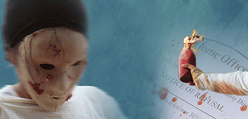 multi-screen installation by Kooj Chuhan (director) + Aidan Jolly, Tang Lin, Jilah Bakshayesh, Miselo Kunda, Hafiza Mohammed - the v02 collective. Three masked figures each on a raft at sea appear on each of three screens arranged as a circular triptych, and their respective identities as official, migrant parent and child unfold. The absence of land makes land more critical to the physical drama in which the surveillance-conscious official finds ways to deny the parent access to safe land and community while also engages in lucrative military games. The parent is occupied looking for her child and trying to salvage her homeland, while her child plays with fragments of photographs of people’s faces which never fit together. The final terror-ridden conclusion is posed as an inevitable consequence, a real-life tableau true to current day conflicts to reflect on. In the absence of any dialogue the installation uses poetic and minimalist devices to depict asylum in the new world order, and each repeat loop of the work has a different soundtrack suggesting alternative meanings for the same reality. A suspended net connects the three screens and the viewers must lower themselves below it to come closer to the lone dialogues from a single screen stranded amongst rocks on the floor below the net. From this emerges intermittent poetry from a ghost-like face, quietly reflecting on the thoughts of one under compulsion to seek a new life. The double-edged uses of blood (symbolising both life and death) and water (allowing respite from land conflict yet uncomfortable due to its temporary nature) are also central to the visual language of the work. The artists chose not to deflect from the stark realities that human individuals are responsible for both causes and consequences of a grim world order in which global conflict is created or fertilised by western interests which then demonise the asylum-seeking products of that conflict. Through collaboratively developing Tang Lin’s minimalist poetry on the beauty and suffering of such human concerns, this incredibly compact and cohesive work manages to emotively engage with a truly epic political narrative. |
